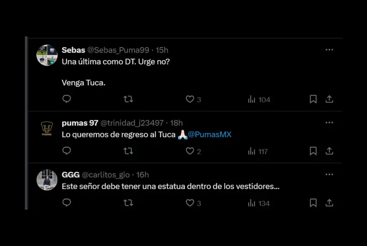 Aficionados por medio de la red social "X" se hicieron sentir con publicaciones como: "Una última como DT. Urge no? Venga Tuca", " Lo queremos de regreso al Tuca".