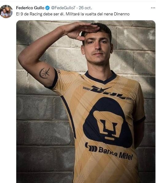 “El 9 de Racing debe ser él. Militaré la vuelta del nene Dinenno”, escribió en sus redes sociales, acompañado de mensajes de aprobación por parte de los hinchas de La Academia como “Me encanta, lo vengo pidiendo hace 6 meses, pero en México es titular indiscutido y no te lo largan fácil”, señaló un seguidor.