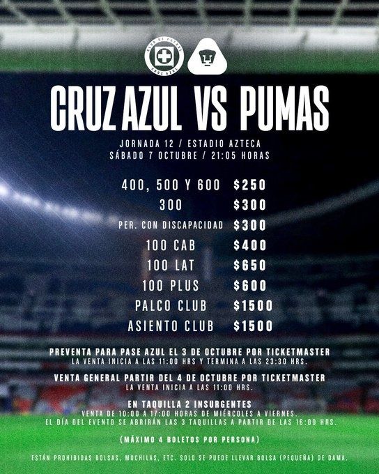 Los boletos para la jornada 12 salieron este martes a la venta en Ticketmaster para la afición celeste, mientras que la venta general se libera este miércoles 4 de octubre en punto de las 11 de la mañana en el mismo portal, mientras que la taquilla 2 insurgentes de igual forma será desde el miércoles en un horario de diez de la mañana a cinco de la tarde, y los costos para el encuentro son los siguientes: