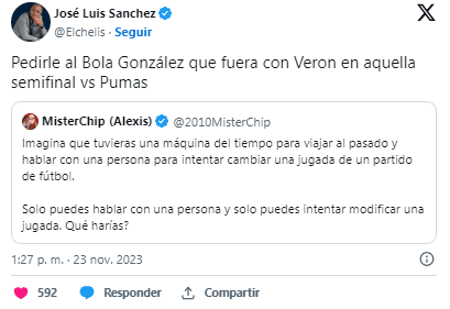 Han pasado 14 años desde aquel dulce momento que no solo nosotros recordamos como si fuera ayer, el propio Chelis aún tiene la espina clavada, pues el ahora analista de ESPN entró a la dinámica de “X” en dónde MisterChip pregunta a sus seguidores que harían si tuvieran una máquina del tiempo y pudieran hablar con un jugador para cambiar una jugada de un partido, a lo que el ex técnico del Puebla comentó lo siguiente: