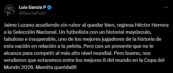 Sin embargo quien no se quedó callado ante esta situación ha sido Luis García, quien fiel a su estilo no se guardó nada ya que además de exponer los motivos por los que considera que Herrera ya no es un jugador seleccionable a pesar de su buen pasado futbolístico, además, el “Dr.” tachó a Jaime Lozano de intentar quedar bien, sin mencionar con quien, aunque sabemos que detrás de esos partidos en Estados Unidos son para engordar la cartera de los federativos y hay que contar con esas figuras para hacer atractivo un duelo ante Uzbekistán.