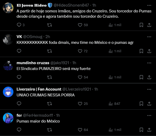 Desde hace unos días cuando se anunciaba el fichaje tras bambalinas comenzaron los mensajes amistosos entre ambas aficiones, sin embargo, una imagen de la cuenta @Momentossublimesdepumas en la red social “X” en donde le tira al Atlético Mineiro, equipo rival del Cruzeiro, hizo que entre los seguidores del nuevo club de Dinenno reaccionaran de forma positiva mencionando que ahora no solo cuidarán a Dinenno sino que estarán muy pendientes de lo que ocurra en México con Pumas pues ahora ha nacido una hermandad entre ambas aficiones y todo por el traspaso de Juan Dinenno.