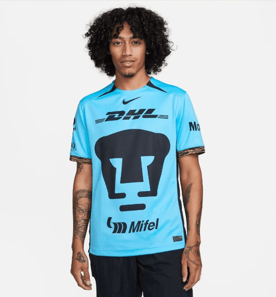 Así, el día de hoy, alejado de los eventos que Nike hizo para presentar anteriores indumentarias, Pumas reveló, lo que hace unas semanas te informamos, el 3er uniforme del Club Universidad se salía de lo convencional y ahora presenta un tercer uniforme en color azul aqua con tonos en negro y en dorado que desde ya la convierten en una de las playeras más raras que hemos tenido.