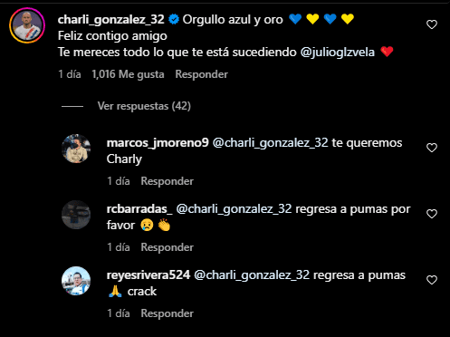 Pumas ha presumido a su arquero nacional por diferentes medios y formas, y en Instagram, en la imagen que anunció su convocatoria, Charly comentó y saludó a su compañero, iniciando con un “orgullo azul y oro” que a la afición simplemente volvió loca y muchos pidieron su regreso aprovechando su comentario de felicitación.