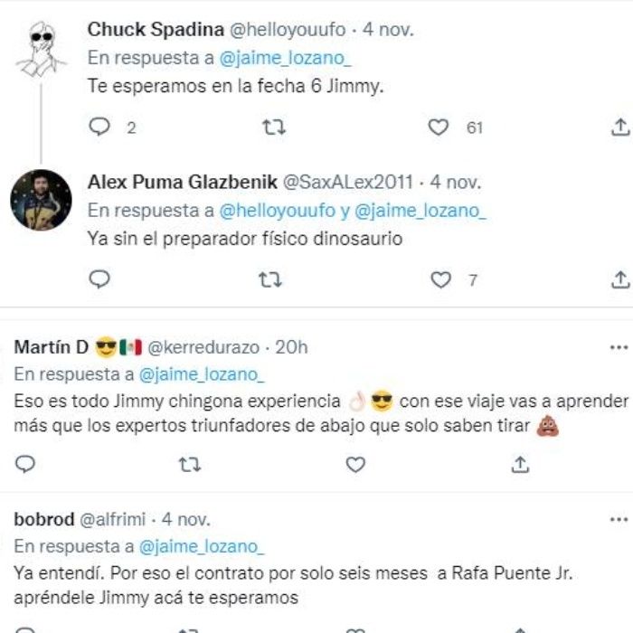 Los comentarios para Lozano hacen referencia a que en algún momento lo veremos como el técnico de Pumas, incluso un aficionado le escribió “Te esperamos en la Jornada 6”. No hay duda de que la directiva se habría sacado a la afición de encima si hubiera puesto a Jaime en el banquillo.